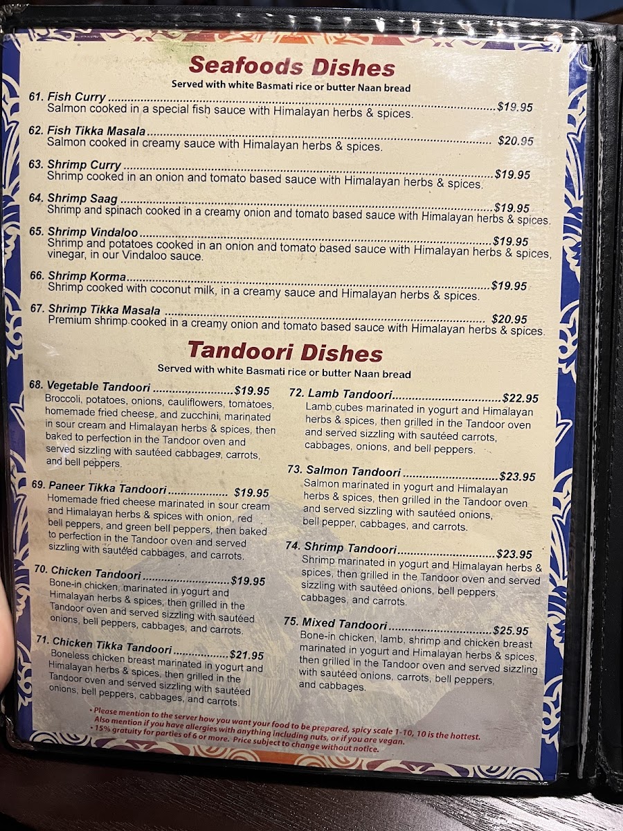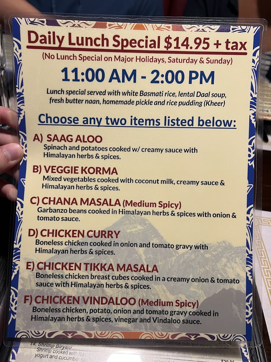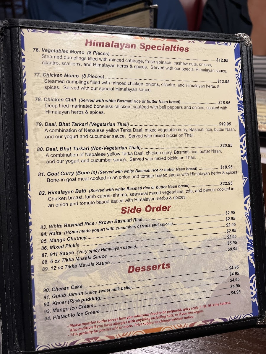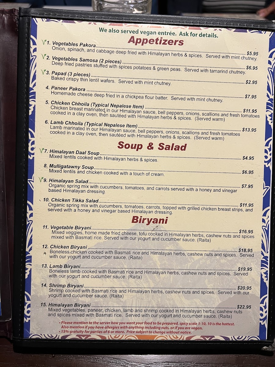 If you're in the mood for something unique, the Himalayan Cuisine Menu offers a delightful array of dishes that transport you straight to the heart of the Himalayas. Located at 7918 El Cajon Blvd P, La Mesa, CA, this spot is perfect for anyone looking to explore the rich flavors and traditions of Nepal and Tibet. From aromatic momos to savory curries and flavorful rice dishes, each item on the menu is crafted with fresh ingredients and authentic spices that bring warmth and depth to every bite. Whether you're a fan of spice or prefer something more mild, there's something to satisfy every palate here. The menu is a great introduction to the diverse tastes of the region, making it a must-try for anyone craving a new culinary adventure.