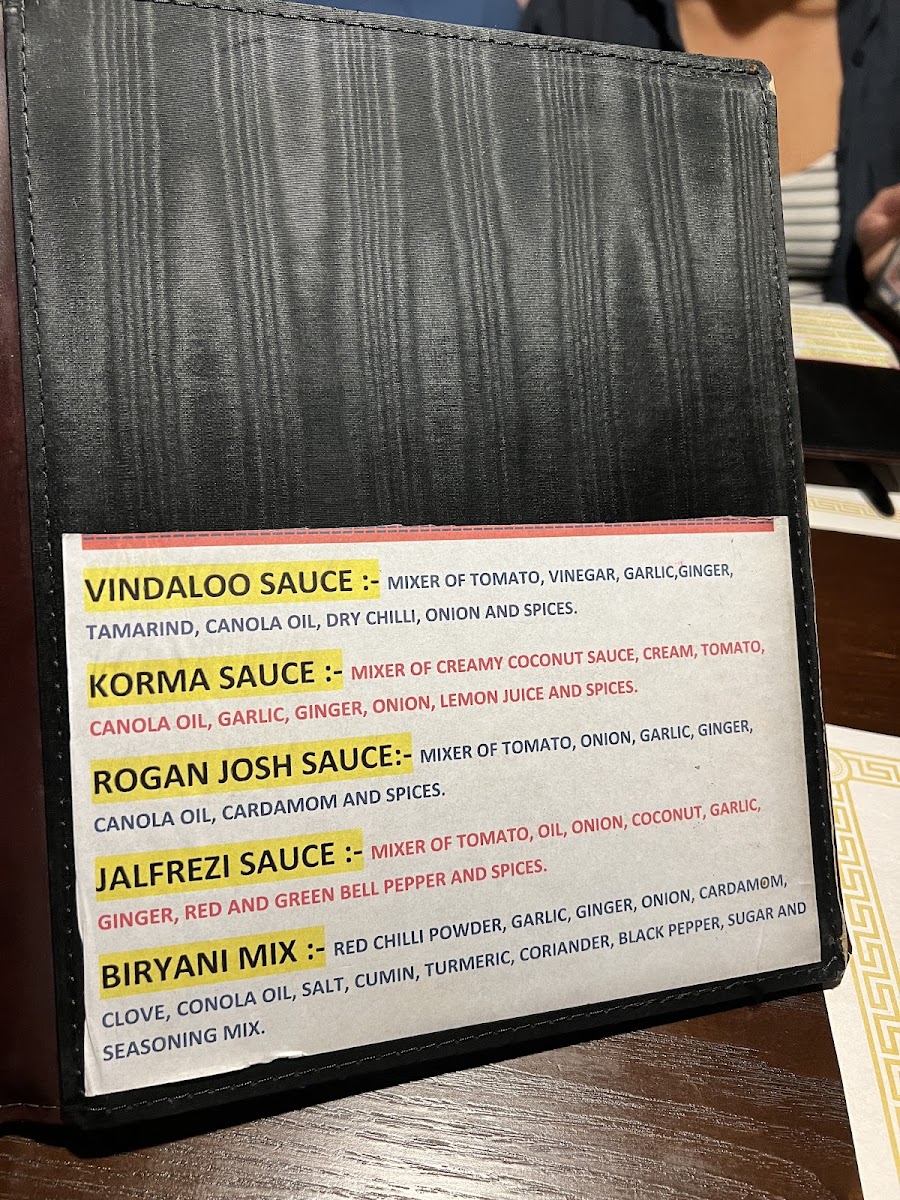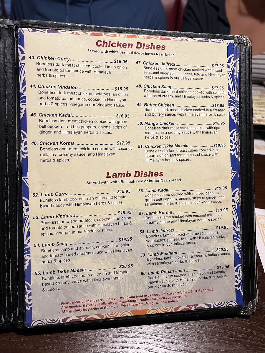 Boneless dark meat chicken cooked with ripe mangoes, in a creamy sauce with Himalayan herbs & spices